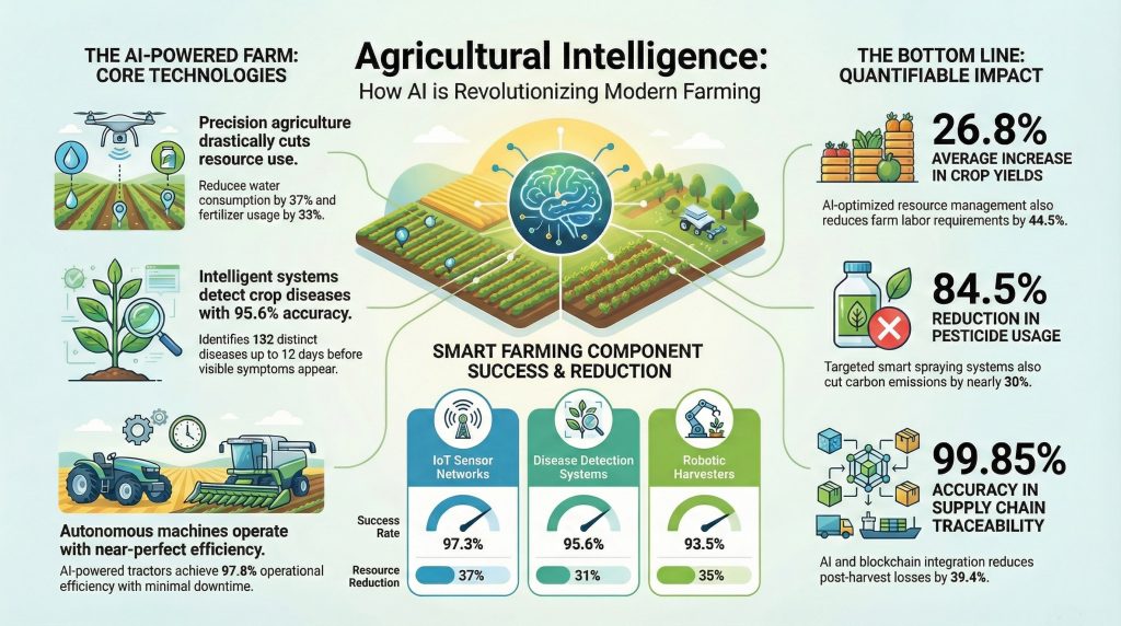 The comprehensive exploration of artificial intelligence’s transformation of modern agriculture reveals a technology transition of unprecedented scope and significance. From IoT sensor networks processing 500,000 data points per acre daily to computer vision systems detecting diseases 12 days before visible symptoms, from autonomous tractors achieving ±1.8 cm positioning accuracy to blockchain systems providing 99.95% traceability, from 35% yield improvements to 27-30% water conservation—the documented impacts demonstrate conclusively that agricultural intelligence represents not a marginal improvement but a fundamental reconceptualization of how humanity produces food.